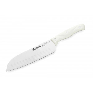 Восточный (точнее – японский) собрат шеф-ножа. Настолько же универсален, но отличается техникой применения. Великолепно справляется с нарезкой морепродуктов и зелени (важных ингредиентов восточной кухни).