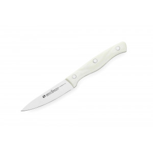 Этот нож – самый маленький (85 мм) и лёгкий в наборе. Но при этом он тоже очень полезен. Потому что удобен и даёт возможность маневра. Не только очистка фруктов и овощей от шкурки, но и такие тонкие манипуляции, как удаление глазок, семян и битых частей мякоти – его задача. И справляется с ней он на оценку "отлично".