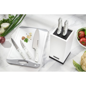 Универсальная подставка для ножей – ещё одна изюминка этого набора. Ее стильный лаконичный дизайн украсит самую современную кухню. При этом, несмотря на свою компактность, она с лёгкостью вместит в себя ножи самой разной формы и размера.