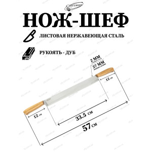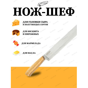 Нож для сыра и масла с двумя ручками - профессиональный кухонный инструмент, предназначенный для нарезки цельных головок сыра, особенно твердых сортов, таких как пармезан; пирожных или больших кусков охлаждённого масла, мармелада. Также большой двуручный нож можно использовать при мыловарении. Длинное острое лезвие из прочной нержавеющей стали толщиной 2 мм с двух сторон оснащёно крепкими деревянными ручками и долго сохраняет заточку. Поварской кухонный нож не крошит продукты, при нарезании получается идеально ровный срез по всей длине. При нарезке твердых видов сыров ручным способом рекомендуется соблюдать простую технологию -двуручный нож следует держать не перпендикулярно продукту, а слегка под углом; надавливая на ручки, наклон следует чередовать. Профессиональный нож для сыра с длинным полотном лезвия из высокопрочной стали легко справится с любыми сортами сыра и масла. Деревянные рукоятки не дают соскользнуть рукам и получить травму. Столовый нож не гнется и больше подходит для работников в ресторанах, кафе, супермаркетах, гастрономах, специализированных сырных магазинах и сыроварнях. Гастрономический нож рекомендуем тщательно промывать проточной водой и вытирать насухо тканью, особенно после контакта с луком и лимоном во избежание окисления. Также кухонный нож резак можно мыть в посудомоечной машине 60 см при щадящем режиме, положив его по диагонали. Нож для сыра подходит для интенсивного использования, может послужить полезным подарком для повара или сыродела.