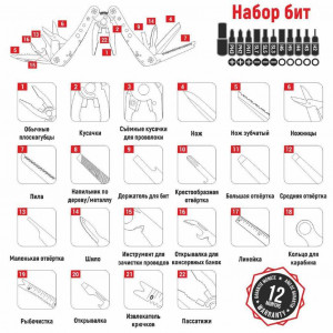 | Дополнительная информация | ножи с гладкой и Серрейторный заточкой, пила, открывалка для консервов, ножницы, шило, две небольшие плоские отвертки |
