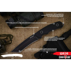 Конструкционно танто 10535 – это фултанг, то есть клинок и хвостовик являются одним целым, без каких-либо утоньшений. На этот полноценный хвостовик и прикреплены две качественно обработанные накладки из композита G 10 черного цвета. Накладки выфрезерованы и текстурированы таким образом, чтобы добиться максимальной, на все 100%, сцепляемости с ладонью и комфортности удержания. Нож надежно ложится даже во влажные руки.