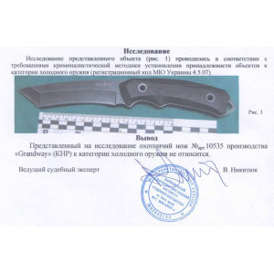 Нож 10535 комплектуется заключением эксперта, подтверждающим, что он не является холодным оружием. Ножны нескладного танто изготовлены из прочной кордуры, они удобны для ношения его на ремне и для хранения все остальное время.