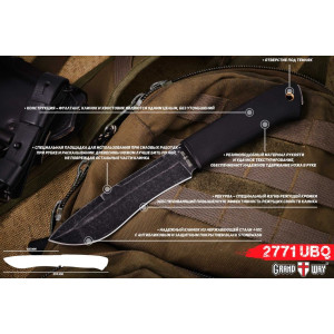 При такой конструкции рукоять и клинок у 2771 UBQ – одно целое, и ломаться в этой конструкции совершенно нечему. В окончании рукояти сделан небольшой выступ – своеобразный обозначитель цельности ножа. Также его можно использовать как стеклобой и дробитель различных твердых материалов. Оснащен он и отверстием для подвеса темляков или страховочных шнуров.