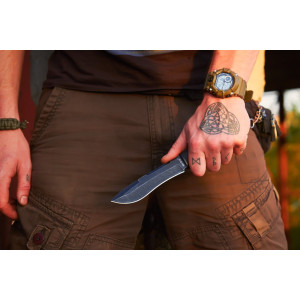 Также, клинок ножа обработан по технологии стоунвош, снабдившей его темным защитно-декоративным покрытием.