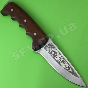 Изображение на клинке ножа может варьироваться от представленного на данном фото, так как изготовитель может изменять вид гравировки без ведома. Оттенок дерева на рукояти и кожаных ножен может отличаться от представленного на фото.