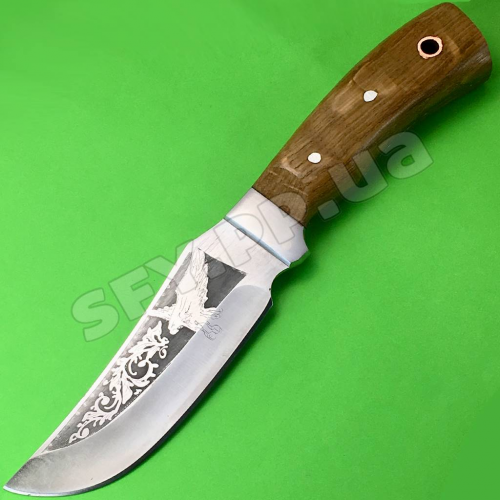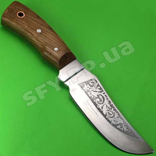 Изображение на клинке ножа может варьироваться от представленного на данном фото, так как изготовитель может изменять вид гравировки без ведома. Оттенок дерева на рукояти и кожаных ножен может отличаться от представленного на фото.