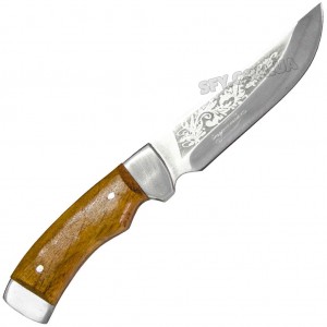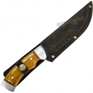 Изображение на клинке ножа может варьироваться от представленного на данном фото, так как изготовитель может изменять вид гравировки без ведома. Оттенок дерева на рукояти и кожаных ножен может отличаться от представленного на фото.