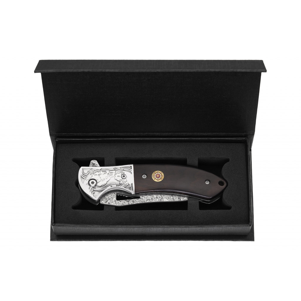 Теплые, глубокие оттенки сандала, из которого изготовлены накладки рукоятки, идеально гармонируют с холодным блеском стали, создавая чувство благородства и силы. Травление и латунная отделка подобраны со вкусом и действительно подходят этому ножу.