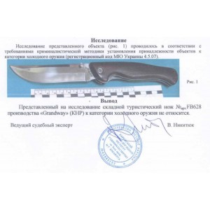 Все эти габариты не определяют складной нож 628 в категорию холодного оружия, для его покупки и использования специальная документация не требуется, что подтверждает сопровождающее заключение экспертизы.