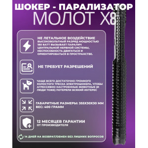 Електрошокер кийок X8 Police – нелетальна зброя з нокаутуючим дією. Поєднує в собі фізичну силу металевої палиці та шоковий ефект електричного розряду. Чинить паралізуючу дію на нервову систему, вирубуючи агресивно налаштовану людину на час до 40 хвилин!