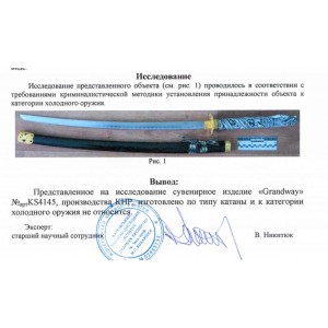 Рукоять цілком достовірно імітує слонову кістку. На сталевому клинку катани навіть є імітація лінії гарту – хамон! Безперечно, ці деталі надають мечу достовірності. Вона виглядає як легкий і багато декорований меч придворного епохи Едо, часу коли японські мечі досягли максимальної розкоші у своєму образі.