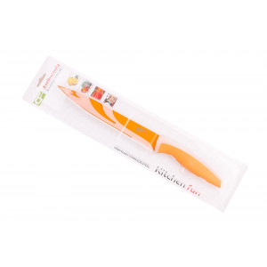 Дуже часто виникає ситуація, коли ніж треба взяти із собою. Це може бути пікнік, особистий ніж для офісної кухні або просто кухонний ніж у бардачку машини. Звичайно, можна взяти складаний ніж, але у них, як правило, клинок набагато коротший, та й мити їх не завжди зручно. Ножі в піхвах або чохлах часто є прерогативою ножів туристичних або мисливських, у масивних шкіряних піхвах з міцними мечами, але для того, щоб спорудити собі бутерброд або почистити яблуко, таке спорядження буде надлишковим.Компанія GrandWay пропонує вашій увазі компактні кухонні ножі з чохлом.Клинки цих ножів виготовлені зі сталі марки 420. Проста відпрацьована у виробництві сталь із чудовою стійкістю до корозії, непогано тримає заточування на продуктах і легко правиться практично всіма точилками. Строй самого клинка з плоскими спусками від обуха розрахований на комфортний різ продуктів та малий кут заточування.Яскраве покриття на клинку не тільки робить ніж стильним і ошатним, але ще додатково захищає ніж від можливої корозії, не дає загубитися ножу, що впав на пікніку, і покращує різ, не даючи продуктам налипати на клинок.Надійні пластикові піхви-чохол не призначені для носіння на тілі, зате роблять ніж безпечним і дозволяють переносити його не загортаючи ні в які папірці або пакети. Ніж просто можна покласти разом із продуктами не побоюючись, що гостре лезо проріже сумку або поріже руку. Так само, при зберіганні ножа в ящику кухонного столу разом з рештою посуду, такий чохол убереже край від затуплення.Рукоятка виготовлена з пластику з м'якими вставками, що не ковзають, що забезпечує впевнене утримання і комфортну роботу.Стильний ніж з довгим мечем, якому під силу робота з будь-якими продуктами. Хліб, ковбаси, фрукти, овочі і навіть дині, кавуни та гарбуза. Довгому і вузькому клинку все по плечу.