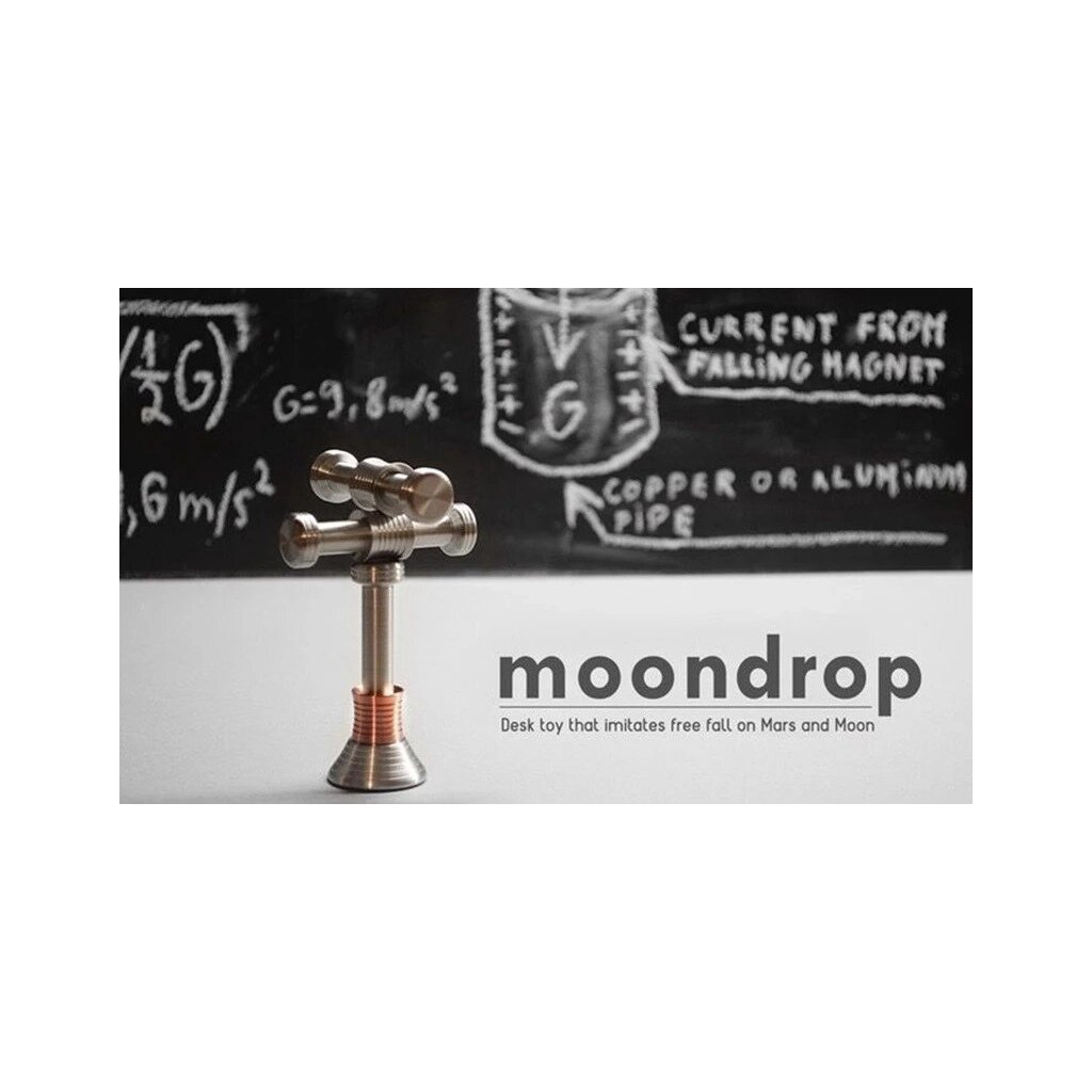 З цією простою, але оригінальною іграшкою, Ви зможете на власні очі побачити ефект гравітації на Місяці, перебуваючи у себе вдома. Весь секрет криється в особливому положенні магнітів і використанні правила Ленца, яке говорить: «Індукційний струм завжди має такий напрямок, що він послаблює дію причини, що збуджує цей струм.» Насправді це означає, що падіння мідних кілець по штифту уповільнюється за рахунок магнітного поля, створюваного вбудованими в корпус іграшки магнітами. В результаті Ви отримуєте забавну іграшку, якою можна зайняти руки, коли нічого робити. Оскільки Fidget Moondrop зроблений з металу, він буде служити практично вічно. Компактність іграшки дозволяє носити її із собою в кишені, при цьому Ви навіть забудете, що вона з Вами.