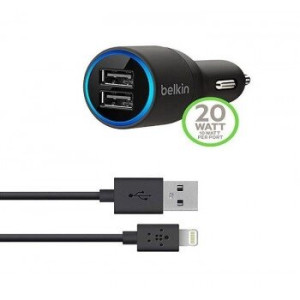Автомобільний зарядний пристрій Belkin Car Charger з двома портами 20Вт, 2.1А та кабелем Lighting з підтримкою пристроїв iPhone та останніх поколінь iPod та iPad.