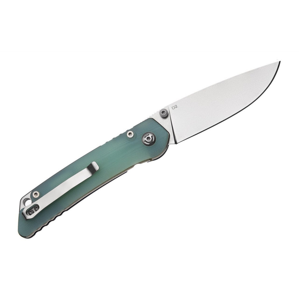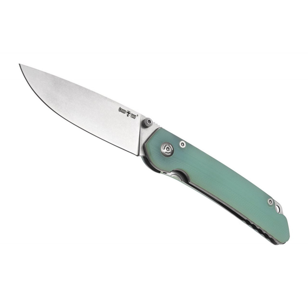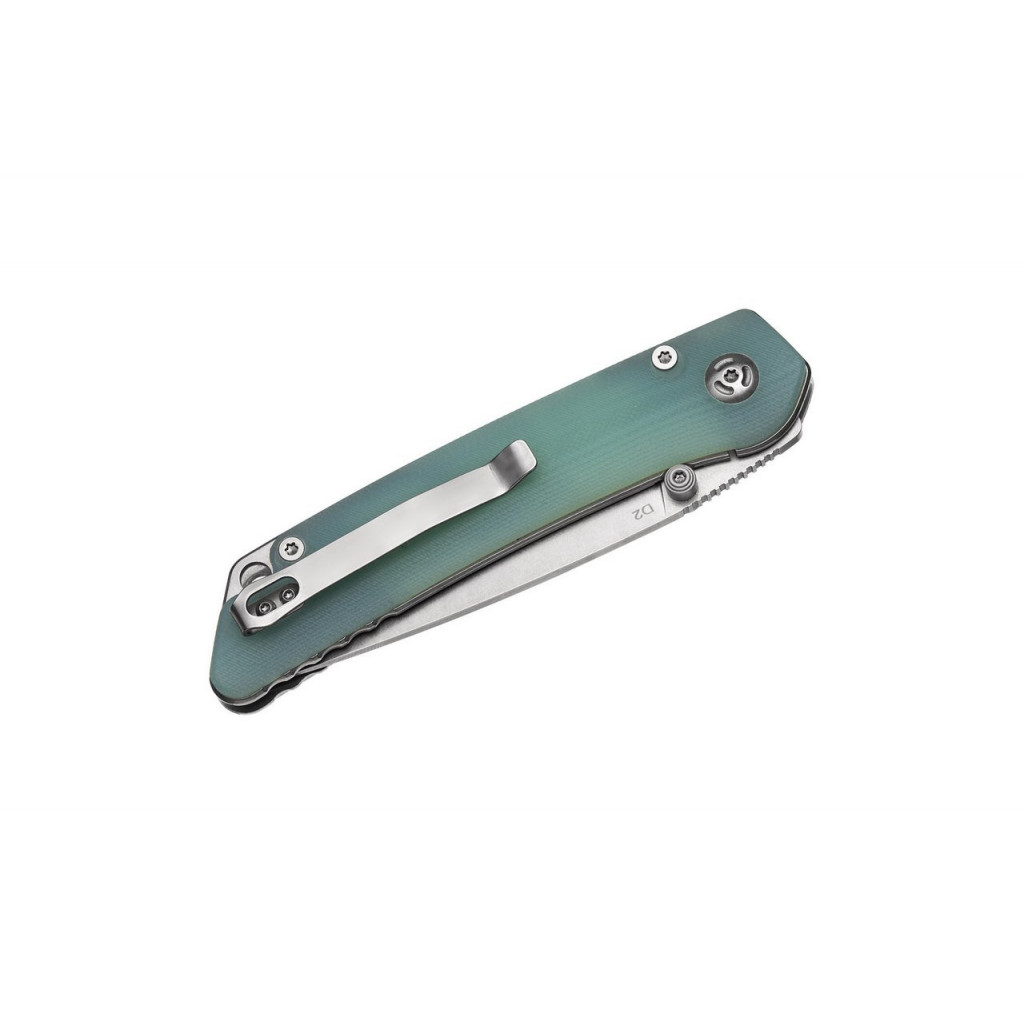 Grand Way SG 041 Black має клинок типу drop point, виготовлений зі сталі марки D2. Спуск ножа прямий. Розкривається ніж за допомогою шпеньків. Процес розкриття легкий та плавний. Що не дивно, якщо врахувати високу якість виготовлення моделі Grand Way SG 041 Ivory в цілому та її осьового механізму зокрема. Клинок фіксується сталевою пружиною замку liner lock.