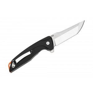 Рукоятка складається з двох сталевих лайнерів із накладками з надежного композиту G10. Сталева кліпса допоможе надійно закріпити ніж на кармані. Темлячне отвір розташоване в яскравому помаранчевому бекспейсері. Враховуючи, що такий ніж може стати в нагоді не тільки в місті, а й у поході, яскравий бекспейсер виглядає цілком виправданим і корисним рішенням. Тепер втратити цей ніж у траві буде трохи складніше.